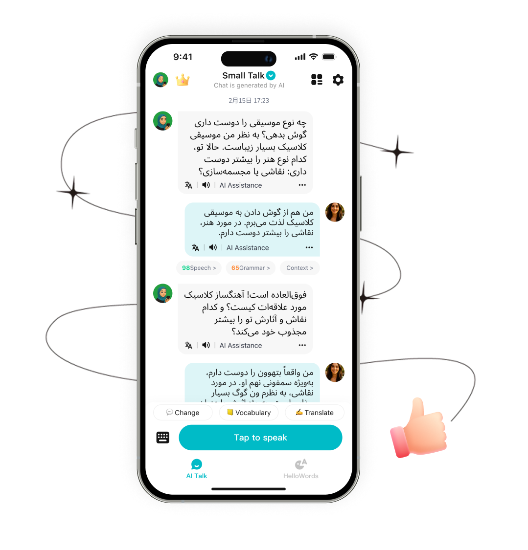 AI 페르시아어 튜터와 무료로 연습하며 실력을 향상시켜 보세요. 모든 대화는 학습자의 필요와 관심사에 맞게 맞춤화되어 있습니다.